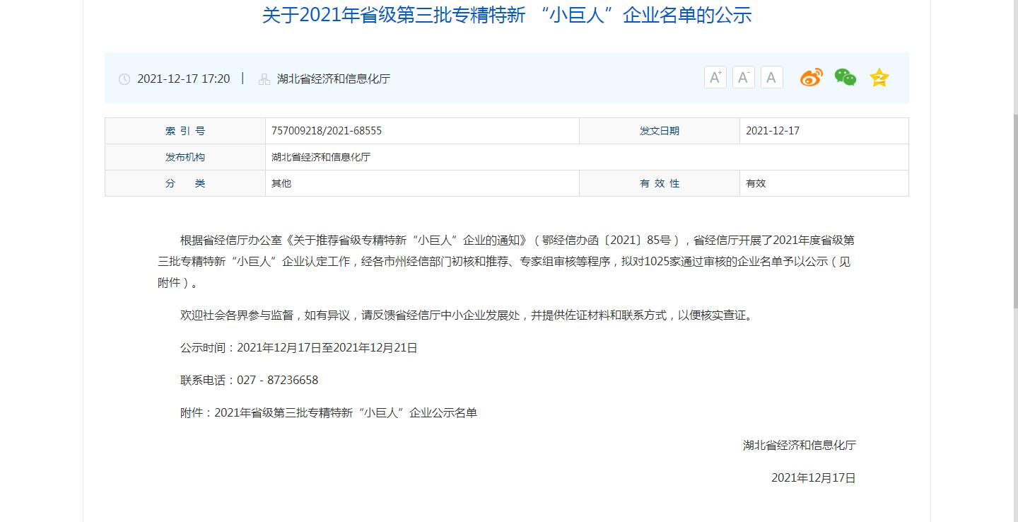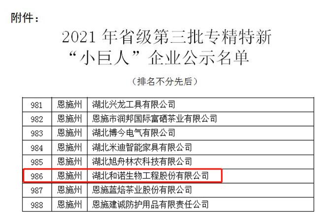近日,湖北省经济和信息化厅公布了2021年度省级第三批专精特新小巨人企业名单,湖北和诺生物工程股份有限公司成功入选,这标志着和诺生物在专精特新、创牌提质工作方面的又一创新突破。