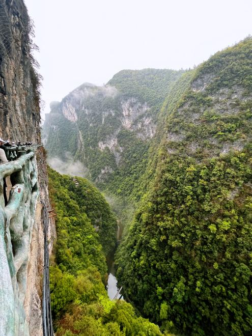 活动当天,大家乘车约三个小抵达屏山大峡谷风景区。步入景区,大家按分组开始了登梯爬高、上下行进的寻美行程。进入检票长廊后各个小组从墨嘎寨入口开启行程,顺着岩壁栈道从上而下相继经过罡步天梯、步云台、阿打铺子集散中心、千寻瀑、浣云桥、兰索桥等景点后来到桃花渡码头乘游船泛舟观赏一线天、五尺门等景点后登岸,后继续顺着山道攀爬至岔溪口观景台、傩愿洞、逍亭,最终到达杜宇楼结束全程。一路下来上千级的山道台,所有职工毅力坚定,积极克服天气影响,挑战身体极限,均按计划行程完成活动。